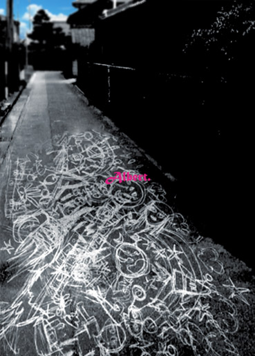 ▲第一話「金剛寺の双子」金剛寺前。阿含と雲水のらくがき。